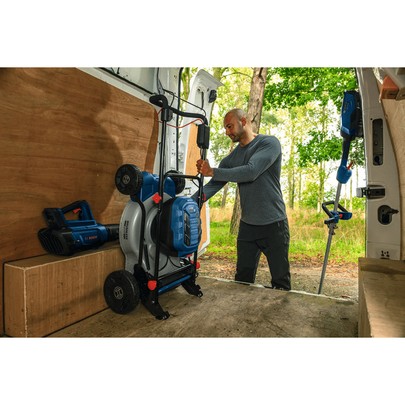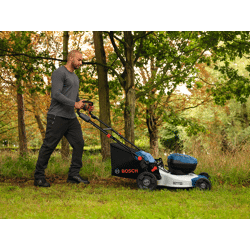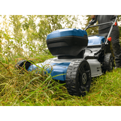 Hoher Komfort dank 46 cm Schnittdurchmesser, stufenlos variabler Geschwindigkeitsregelung, einfacher 2-stufiger Höheneinstellung und Klappgriff für eine platzsparende, senkrechte Lagerung