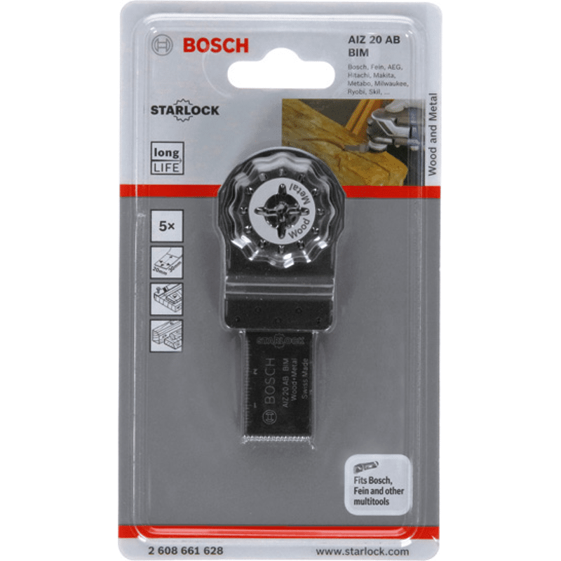 Das Tauchsägeblatt Starlock AIZ 20 AB ermöglicht Feinschnitte in Holz und ungehärtetes Metall. Das schmale Blatt von 20 mm Breite ermöglicht Filigranarbeit. Das robuste Starlock-Aufnahmesystem reduziert Lateralschwingung des Blattes und ermöglicht mittels direkter Kraftübertragung haarfeine Schnitte. Es wird verwendet für das Sägen von Aussparungen in Möbelbauteile, bündiges Ablängen von Kupferrohren und Tauchschnitte in Gipskartonplatten. Dieses Blatt sägt Holz und ungehärtetes Metall, weiche Kunststoffe und Paneele mit Kunststofflaminierung. Die Bimetallverbindung aus Blatt aus HCS-Stahl (Stahl mit hohem Kohlenstoffgehalt) und Zähnen aus HSS-Stahl (Schnellarbeitsstahl) ist verschleiß- und hitzeresistent und gewährt dem Blatt beim das Schneiden von ungehärtetem Metall und abrasivem Material eine hohe Lebensdauer. Das Starlock-Aufnahmesystem ermöglicht einen schnellen Blattwechsel ohne Blattberührung in drei Sekunden. Das Aufnahmesystem ermöglicht durch seine dreidimensionale enge Passung maximale Kraftübertragung zwischen Maschine und Zubehör.