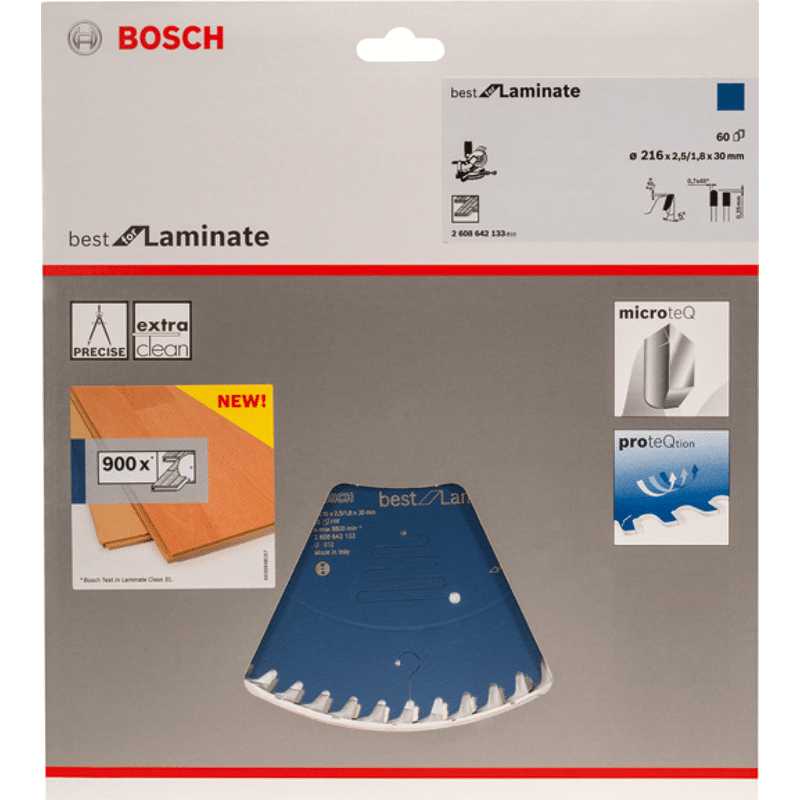 Das Best for Laminate Kreissägeblatt ist robust beim Schneiden von Laminatböden aller Art. Die Schutzbeschichtung Proteqtion verhindert Korrosion und ermöglicht zuverlässige Schnitte, während Reibung reduziert wird. Die Beschichtung hält das Blatt kühl, um es vor Korrosion zu schützen. Diese hohe Leistung und Qualität werden durch die einzigartigen besonders harten Microteq-Zähne verstärkt, die intern bei Bosch hergestellt werden, und aus robustem Carbide-Korn bestehen. Dämpfungsschlitze: Vibrationen und Geräuschentwicklung werden stark verringert sowie die Schnittpräzision und der Arbeitskomfort verbessert. Das Best for Laminate Kreissägeblatt mit HLTCG-Zähnen (High-Low Triple Chip Ground) ist durch diese robust genug für Arbeiten mit den höchst abrasiven Materialien, wie z. B. Laminatböden.