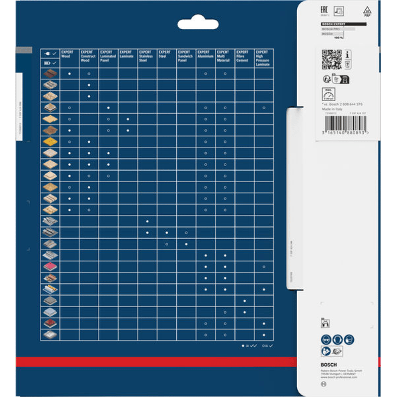 Das Expert for Construct Wood Kreissägeblatt ist höchst resistent beim Schneiden von Bauholz. Die besonders harten Microteq-Zähne werden bei Bosch intern aus höchst robustem Carbide-Korn produziert, um eine hohe Leistung und Lebensdauer sicherzustellen. Beides wird durch die Kombination spezieller Oberflächen und der breiten Zahnrücken unterstützt. Die Körper- und Dehnungsschlitze des Blatts verringern Schwingungen während des Gebrauchs, wirken geräuschdämpfend und reduzieren die Hitzeentwicklung. Das Expert for Construct Wood Kreissägeblatt verfügt außerdem über eine Schutzbeschichtung, die Korrosion verhindert und zuverlässiges Schneiden ermöglicht, während Reibung reduziert wird. Verwenden Sie dieses Sägeblatt bei Bauholz mit Fremdkörpern, wie z. B. Nägeln und Betonrückständen. Das Expert for Construct Wood Kreissägeblatt verfügt über eine ATB- (Wechselzahn) und Pyramidenzahngeometrie für müheloses Schneiden von Bauholz mit und ohne Nägeln.